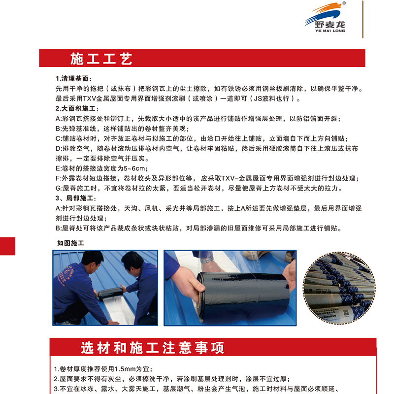 D:在彩鋼瓦搭接處和頂帽上,必須涂抹TXV-天信自粘性彩鋼卷材封邊處理劑。