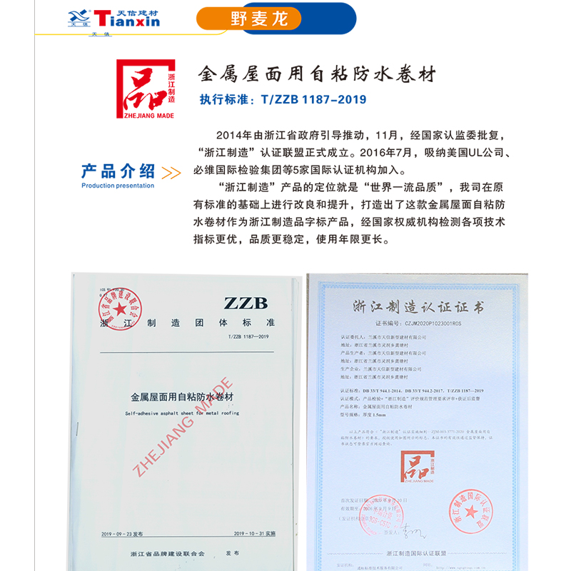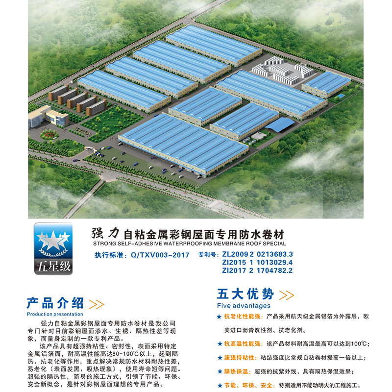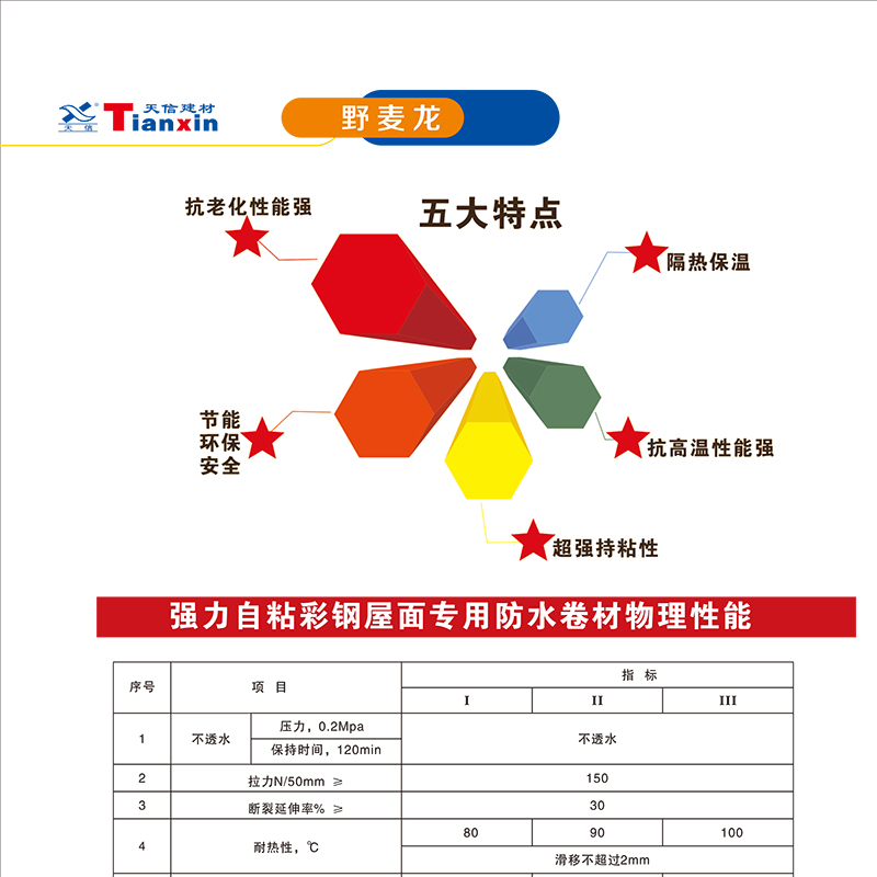 采用特殊的化學(xué)共混改性瀝青為基料,提高自粘卷材的粘結(jié)性能和耐高溫性能。高溫指標(biāo)達(dá)100℃,粘結(jié)強(qiáng)度較普通自粘卷材提高80%。并以金屬鋁箔為覆面,提高了隔熱、抗老化、防水一體化,大大延長彩鋼瓦的使用壽命和彩鋼屋面防水難題。